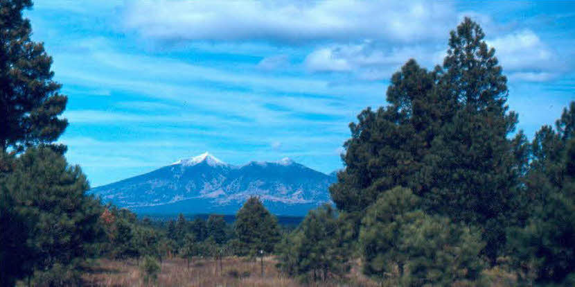 A tree-dotted landscape looking towards the extinct volcanic San Francisco Peaks (vicinity of Flagstaff, Arizona).