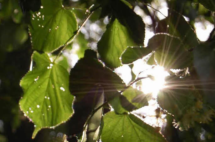 The light of our parent star, a middle-aged yellow dwarf of effective photospheric temperature 5777 K, streams down through the leaves of a lime (Tilia). The quantity of radiant energy arriving on a surface perpendicular to incoming sunlight at the mean distance of the Earth from the Sun (the so-called “solar constant”) is around 1,367 W m-2, and some 38.81% of this energy lies in the PAR range (quantities after data from World Center, Davos, Switzerland, quoted in Iqbal, 1983).