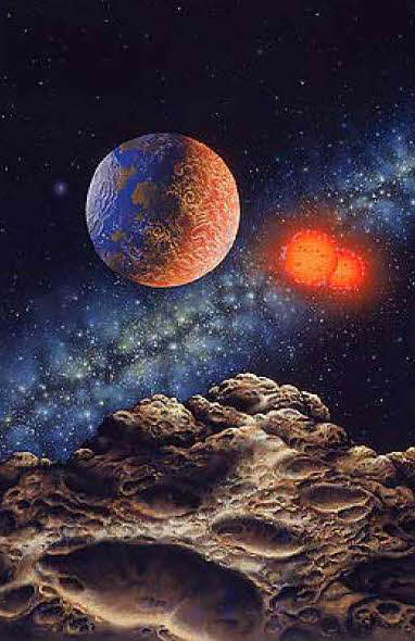 Above: A motif of the CM Draconis system devised by artist Lynette Cook. It illustrates the Milky Way (stars, gas and dust concentrated into the plane of our Galaxy), the red dwarf binary, a hypothetical Earthsized planet in synchronous lock, a white dwarf member of the system (out at ~ 400 AU), depicted here on the far side of the planet, seen from a view-point on a heavily cratered asteroidal body (also hypothetical). More work by Lynette Cook may be found at extrasolar space art